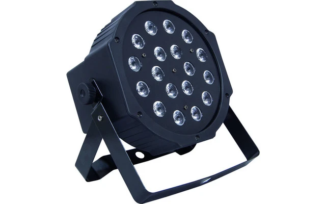 Mark SuperParLED ECO 18 es un proyector de iluminación que incorpora 18 LEDs de 1W c.u. repartidos entre los 3 colores primarios rgbw. Su carcasa está fabricada en aluminio de alta calidad y su sistema de doble asa permite fijarlo en vario spuntos y de diferentes formas, incluso colocada sobre el suelo. Dispone de varios modos de funcionamiento: Audio, Auto, master/slave y DMX. En este último modo, la unidad utiliza 7 canales DMX. En este último modo, la unidad utiliza 7 canales DMX, incluyendo dimmer general, dimmer de cada color primario, strobo y transiciones entre colores.
