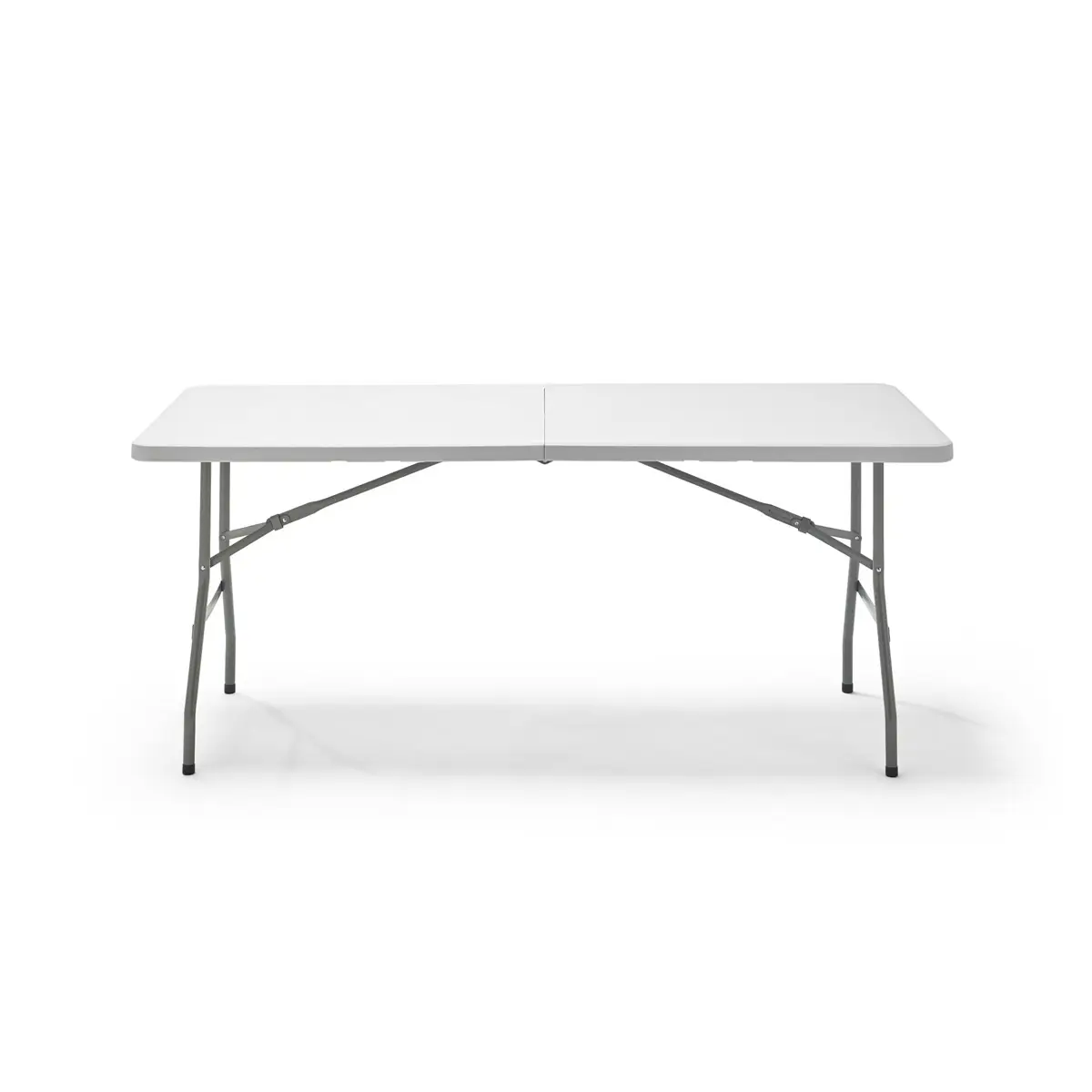 Mesa plegable portátil con estructura de acero y tablero de polietileno de alta densidad, ideal para camping, terrazas, jardín, celebraciones y eventos.