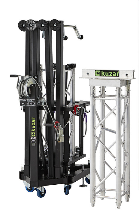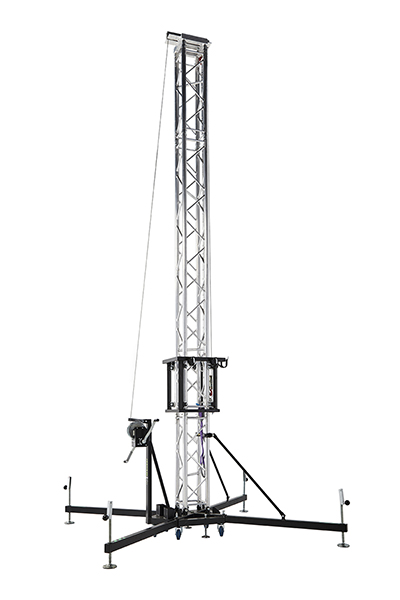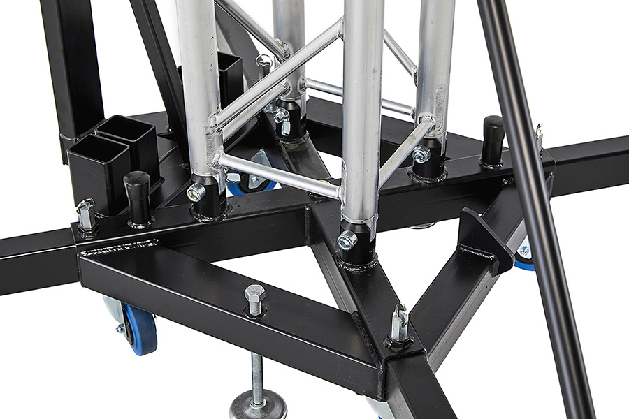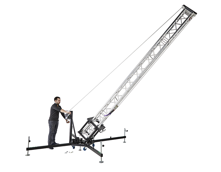 La composición de trusses para formar la torre es de 1m+3m+2m+1m. Puede aumentar hasta los 8m con piezas adicionales. La carga se eleva con polipasto manual. En la base se insertan apoyos antideslizantes y ajustables.