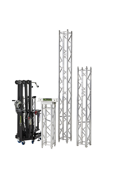 Torre muy fácil de usar, solo es necesaria una persona para manejarla, ya que únicamente accionando el cabrestante la torre vuelca sobre las rotulas de la base y se posiciona en vertical. Con una base de acero que le aporta toda la estabilidad que necesita. El resto de la torre está construida con nuestro truss Kuzar de 30×30cm compuesto por tubos de Ø50mm y 2.5mm de espesor.